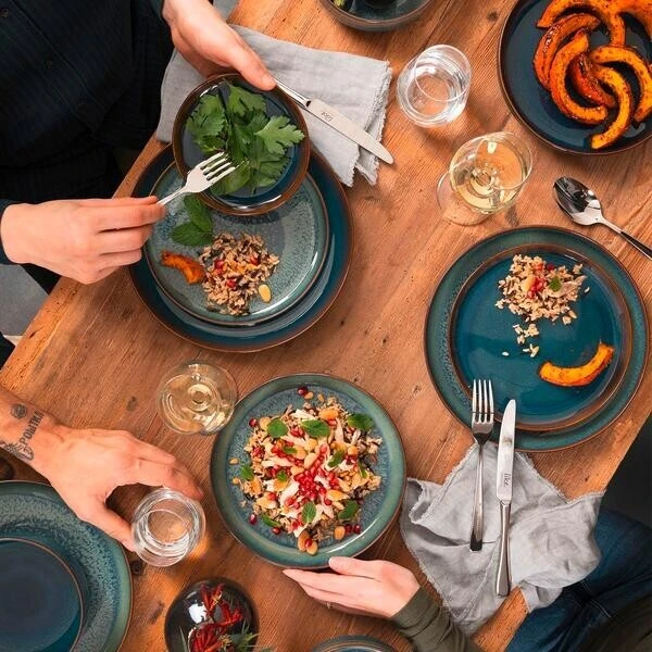 Die beiden Farbtöne Denim, ein intensives Grau-Grün, und Breeze, ein verwaschenes Jeans-Blau, werden durch einen kräftigen Töpfer-Braunton eingerahmt. Jede Farbe für sich wirkt trendbewusst und mediterran. Für Abwechslung auf dem Tisch lassen sich beide Farben mixen und matchen – dank den vielfältigen Kombinationsmöglichkeiten kommt garantiert keine Langeweile auf.