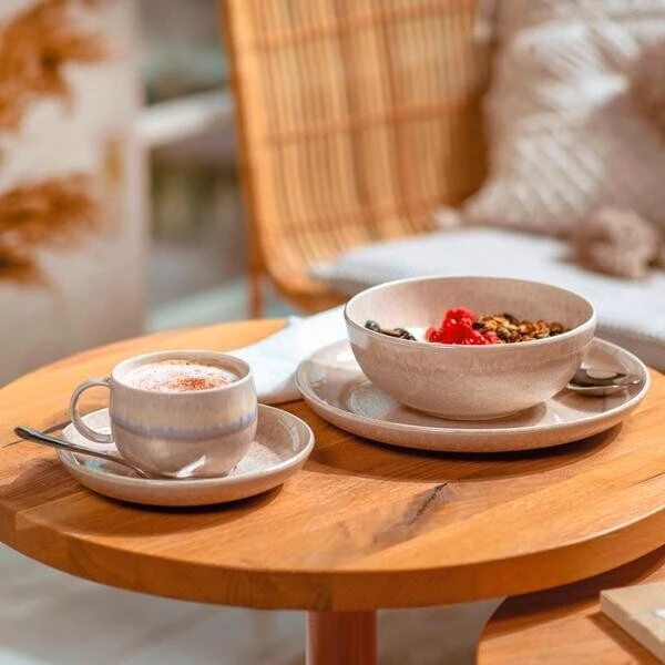 Frisch und aromatisch dampfenden Kaffee aus der Kaffeetasse der Serie Perlemor Sand von Villeroy & Boch genießen – was will man mehr? Das hochwertige Premium Porcelain sorgt mit seinen einmaligen Farbabstufungen und den weich ineinander übergehenden Farbtönen für Einzigartigkeit direkt in Ihren Händen. Für einen ruhigen Moment oder eine gemeinsame Kaffeepause bestens geeignet.