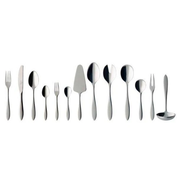 - Set besteht aus: 12 Tafelmesser, 12 Tafelgabeln, 12 Tafellöffel, 12 Kaffeelöffel, 12 Kuchengabeln, 1 Zuckerlöffel, 1 Sahnelöffel, 1 Saucenlöffel, 1 Servierlöffel, 1 Fleischgabel, 1 Tortenheber und 1 Salatbesteck
